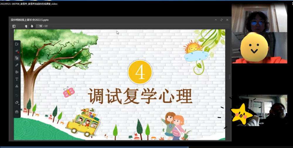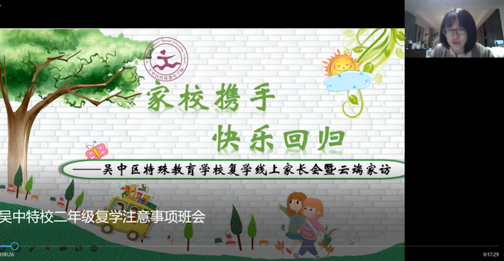 为统筹做好学校疫情防控工作,进一步加强家校联系、携手共进为学生的顺利复课保驾护航,吴中区特殊教育学校各班召开了复课线上家长会暨云端家访活动,以特殊的方式,与家长们“隔屏”沟通。